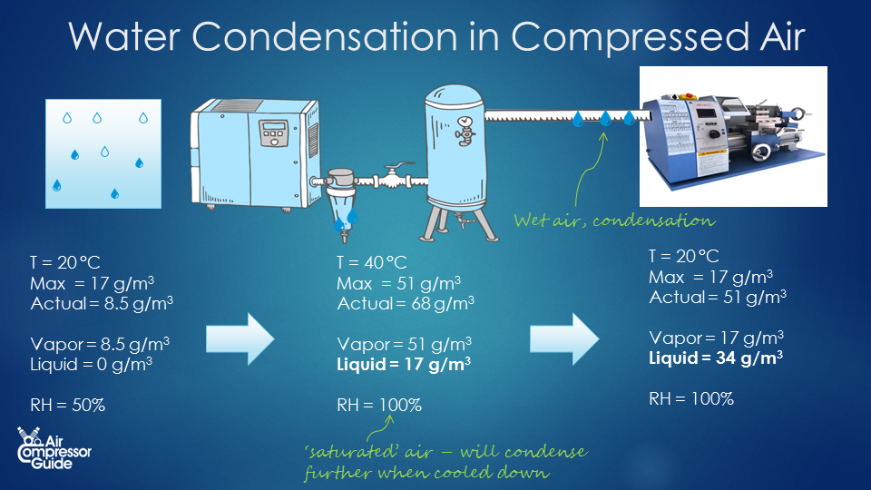 如果進入的水蒸氣高于壓縮空氣可以容納的水蒸氣,一旦被壓縮,它們中的一些會凝結成液態(tài)水。